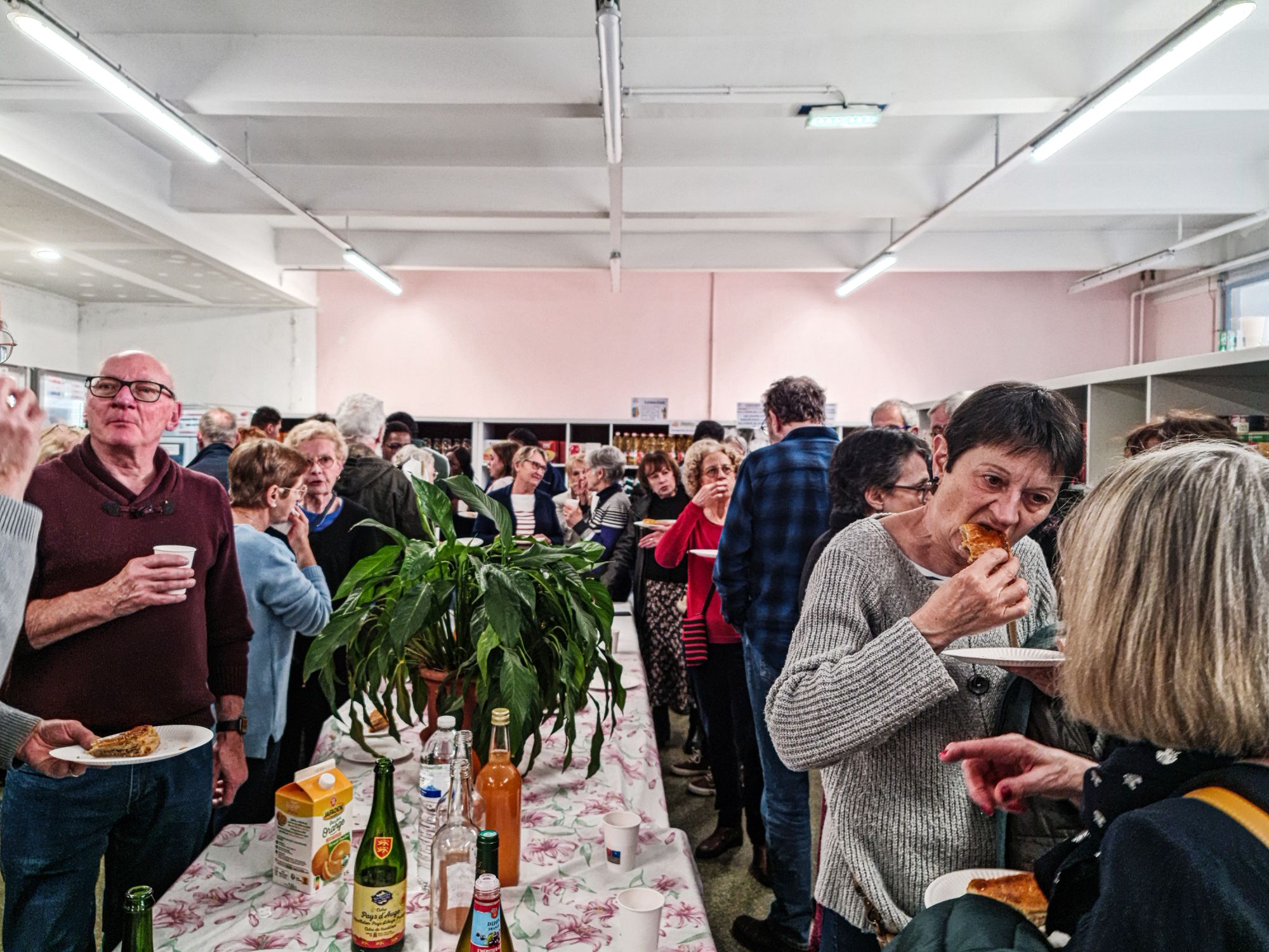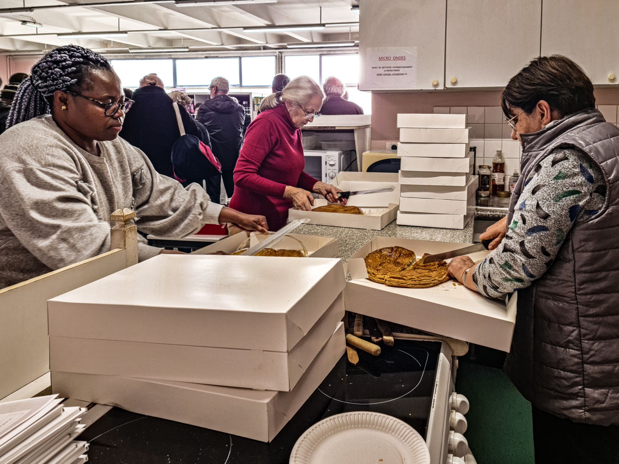 Pendant ce temps, des bénévoles préparent les galettes. Ainsi chacun(e) pourra déguster sa part accompagnée de cidre ou de jus de pommes - ce dernier étant issu des pommes produites par les jardins du Maillon. Les fèves dénichées ont trouvé leurs Reines et Rois.